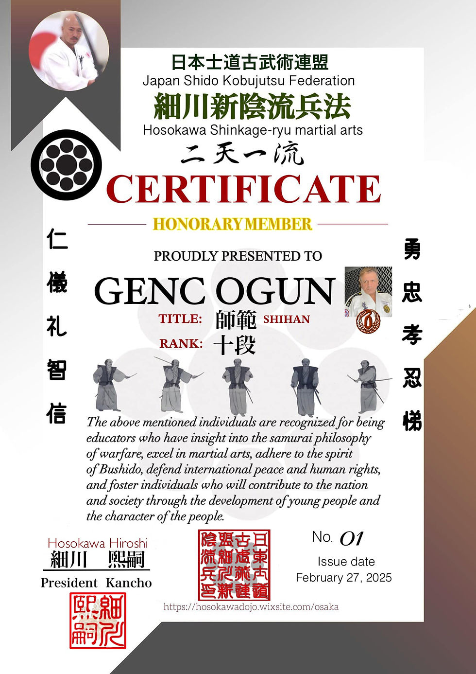 President of Japan Shido Kobujutsu Federation has issued an Honorary Member certificate to Ogun Genc Shihan as a distinguished individual supporting the activities and development of the Japan Shido Kobujutsu Federation, which cultivates the traditions and martial arts of the Hosokawa Clan.