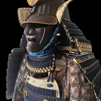 A very impressive Japanese samurai war armor, Iron black lacquer blue thread Mogami Dou Gusoku, all heavy iron for both kabuto and menpo. This set dates from mid Edo Period. (around 1700) The menpo is signed Mito ju Yoshinobu, and is made of iron in the style of Yadome (iron ridge to solidify and protect). This style was seen in more noble samurai. The kabuto signed Ki Yoshimichi was truly built for battle, 16 thick plates able to resist even a musket shot. We can see each individual rivet carefully placed and filed down to perfection. A lovely tall standing multi-layer tehen with same gold matching kamon from the Hosokawa clan. They were a powerful clan so much so the family retained power till today, the former Prime minister of Japan is the current head of the clan. The very large V shape Maedate is fully made of iron and would have made a presence on the battle field.
