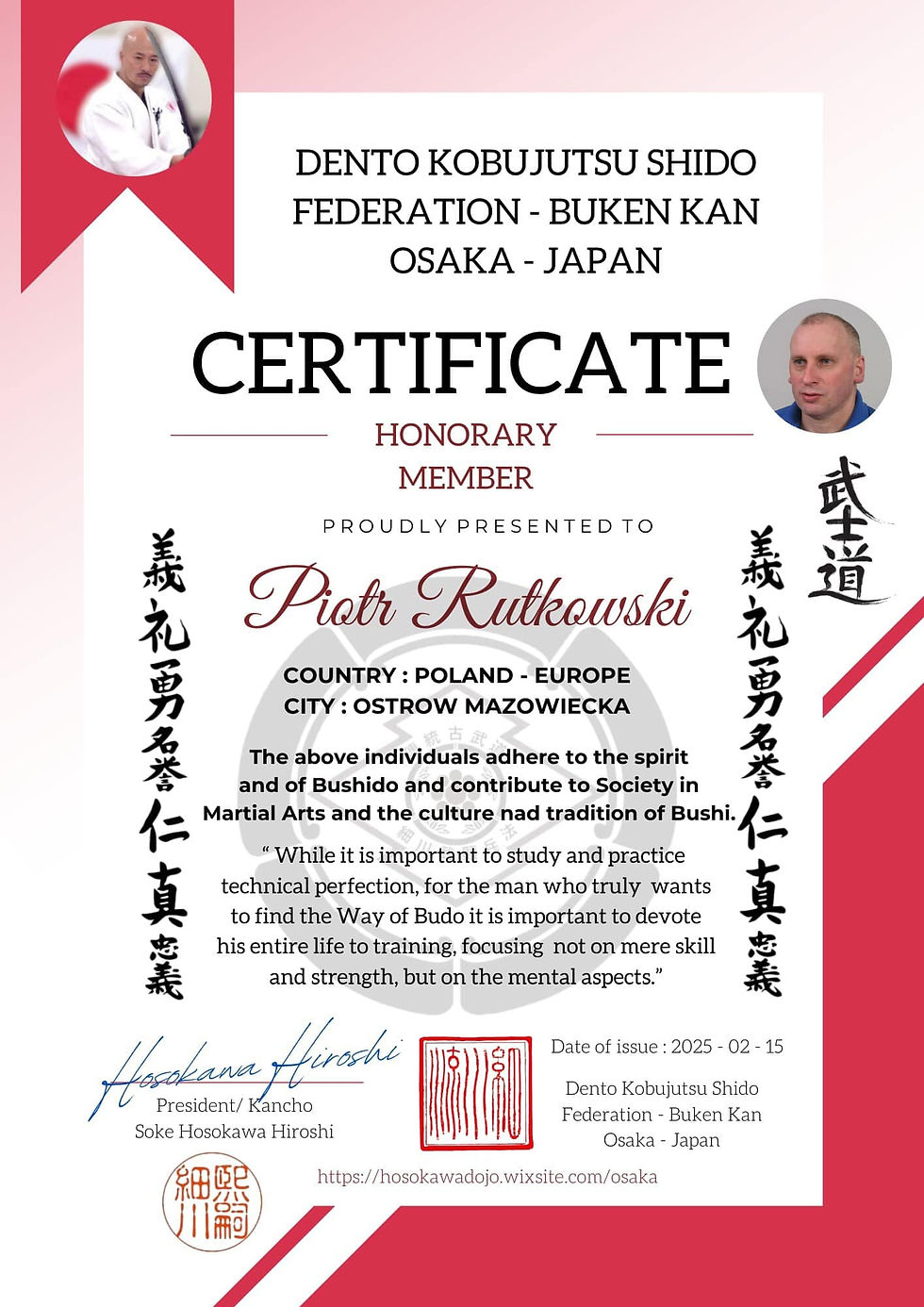It is hereby informed that Mr. Piotr Rutkowski has been awarded Honorary Membership in the Dento Kobujutsu Shido Federation - Buken Kan by Soke Hosokawa Hiroshi, the Founder and President of the Dento Kobujutsu Shido Federation - Buken Kan in Osaka, Japan.