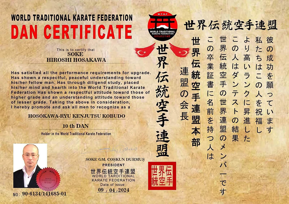 The World Traditional Karate Federation recognized Soke Hiroshi Hosokawa as the 10th Dan Hosokawa-Ryu Kenjutsu Kobudo.